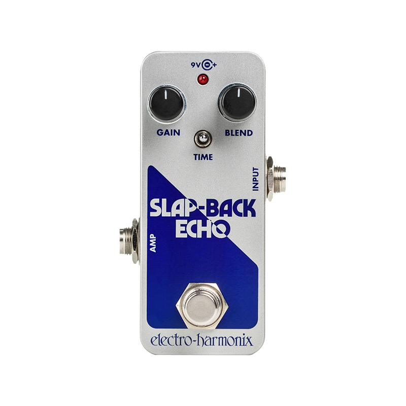 Logé dans un petit châssis EHX, le Slap-Back Echo dispose de boutons Gain et Blend ainsi que d'un interrupteur Time. Le bouton Gain contrôle le signal d'entrée avant le circuit d'écho et ajuste également le volume global à la sortie avec un boost allant jusqu'à +20dB. Le bouton Blend mélange le signal de l'instrument au signal d'écho. Le bouton Time permet de choisir entre trois temps de retard différents : 45 ms, 65 ms et 100 ms.