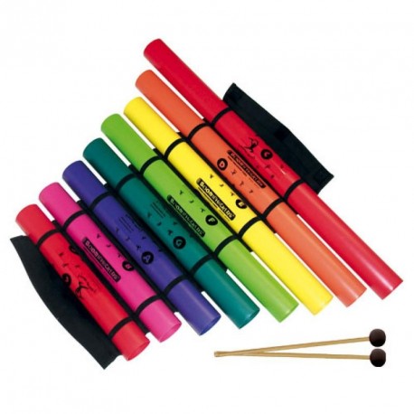 Etui en tissu avec emplacements élastiques pour inserer jusqu'a 8 tubes boomwhackers. Facile à transporter, le boomophone est livré avec 2 mailloches pour jouer comme sur un xylophone ! frappez sur ces notes