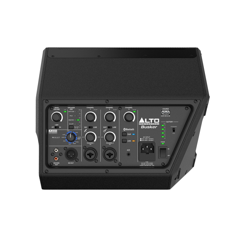 Dotée d'une interface claire et efficace, le Busker met à votre disposition une sélection d'entrées analogiques et numériques complète, un module d'effets signé Alesis, un circuit DSP afin d'adapter au mieux le rendu de l'enceinte en toute situation, et une liaison Bluetooth pour la diffusion, le contrôle par application Alto App et la liaison stéréo avec un autre Busker.