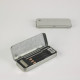 Petite boîte en fer blanc, gravée, format 145 x 50 x 15 mm, contenant 3 crayons (HB), 1 gomme capuchon, 1 taille-crayon, 1 diapason