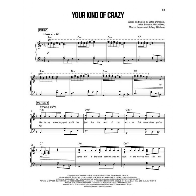 Celebrate the GRAMMY®-nominated soulful sound of Teddy Swims with this collection of songs from his hit album I've Tried Everything But Therapy. Featuring fan favorites like Lose Control, Bad Dreams, and more, this book showcases the powerful vocals and heartfelt style that define his music. Also included is the special bonus track Gone, Gone, Gone. Sheet Music Essentials brings together a thoughtfully curated collection of intermediate-level solo piano arrangements for today's pianists. Featuring complete lyrics and chord symbols, these polished charts are easy to follow and ready to perform. 16 songs, including: Bad Dreams · Black & White · The Door · Funeral · God Went Crazy · Gone Gone Gone · Guilty · Hammer to the Heart · Lose Control · Need You More · Northern Lights · Not Your Man · She Got It · She Loves the Rain · What More Can I Say · Your Kind of Crazy.