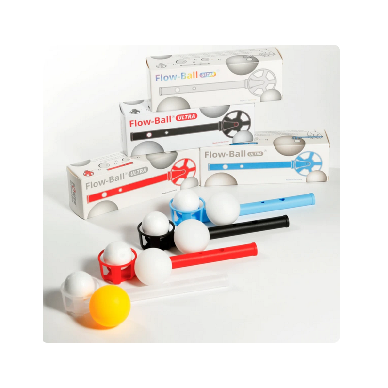 Les deux ouvertures de tailles différentes sur la partie supérieure de la poignée et l'utilisation de deux balles de poids différents offrent huit niveaux de résistance pour l'entraînement. La prise en main est similaire à celle d'une flûte. Avec un peu d'entraînement, le Flow-Ball ULTRA® se prête à de nombreuses utilisations. Utilisez la petite balle pour une faible résistance, la grosse pour des exercices plus avancés et la troisième pour une résistance plus élevée.