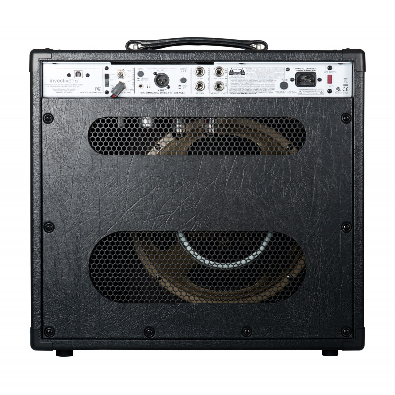 Ampli guitare à lampes Invective 112 Combo 20W (2x EL84), préampli tout lampes (3 x 12AX7/ECC83), 1x 12" Celestion G12H , 2 canaux (Clean/Lead), EQ 3 bandes, sélecteur 20/5/1 watts, impédance 16 Ohms, sortie DI, sortie USB, sortie casque, développé en collaboration avec Misha Mansoor, poids : 16,6 kg, dimensions: 46,35 x 48,89 x 22,86 cm.