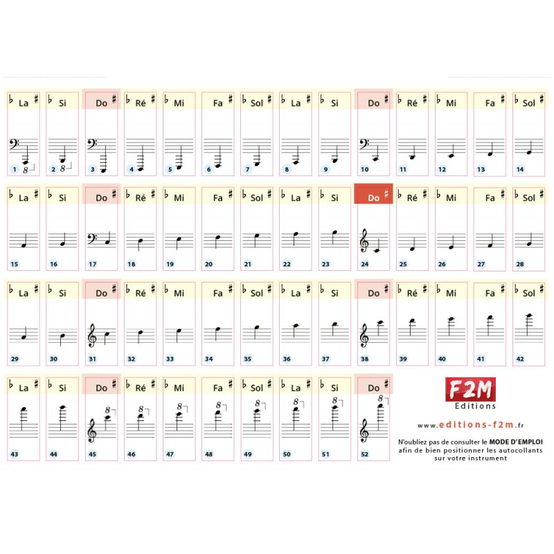 52 AUTOCOLLANTS pour touches BLANCHES avec repères Dièse et Bémol. VINYLE Haute qualité, repositionnable à volonté, à retirer sans aucun résidu.