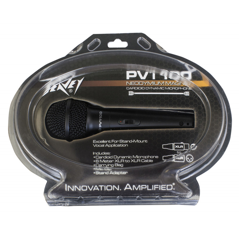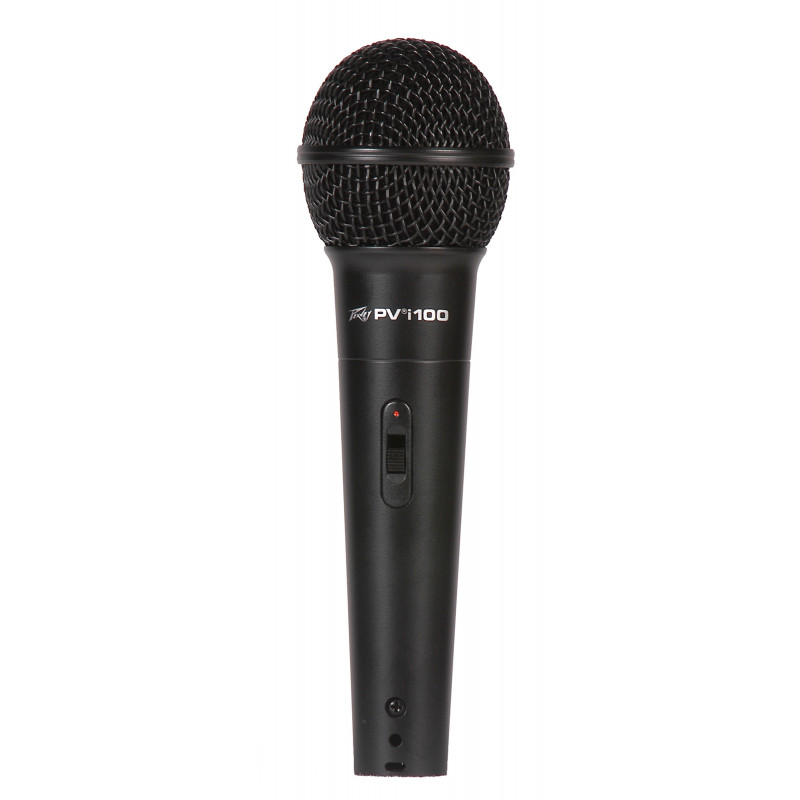 Microphone dynamique cardioïde Peavey PVi 100, interrupteur on/off, idéal pour la voix ou les instruments, livré avec une housse de transport, une pince micro et un câble XLR de 6 mètres, poids total : 0,45 kg, dimensions emballage : 26,67 cm x 9,53 cm x 21,59 cm.
